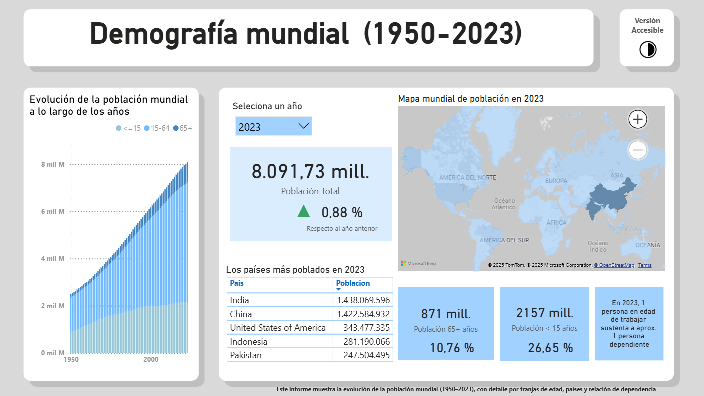 Dashboard interactivo en Power BI que analiza la evolución de la población mundial, su estructura por edades y la relación de dependencia. Incluye versión accesible con alto contraste, simulación en vídeo de distintos tipos de visión y motivación personal hacia la accesibilidad.